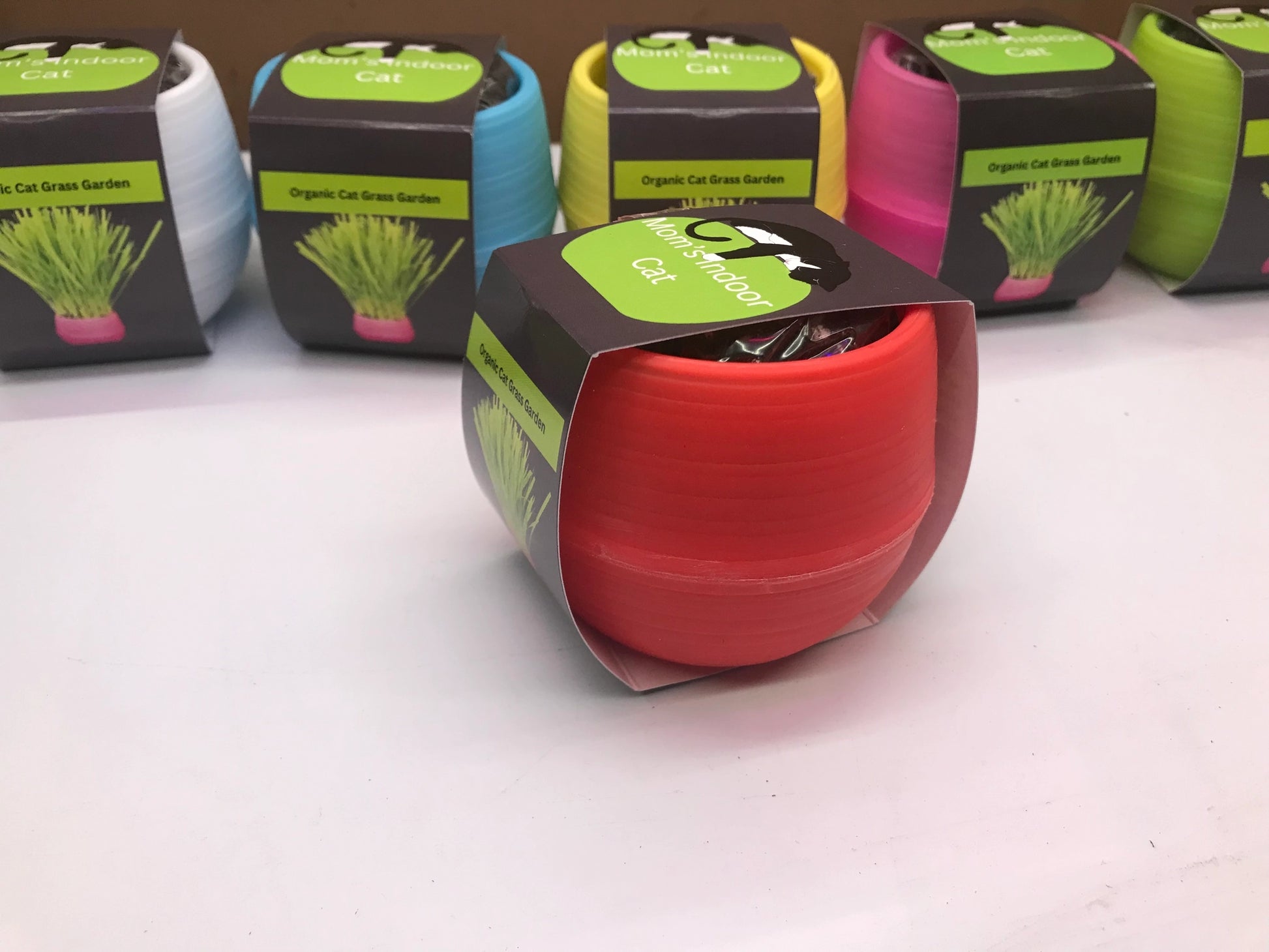 Small, colorful self-watering planters are 3" round. They contain Organic soil and our own organic blend of 4 types of grasses. Rye, barley wheat and oat. The best part is that we have solved the problem of cats pulling out the grass and making a mess. The little brightly colored planters are designed to keep the grass locked into place even with the most playful cats.