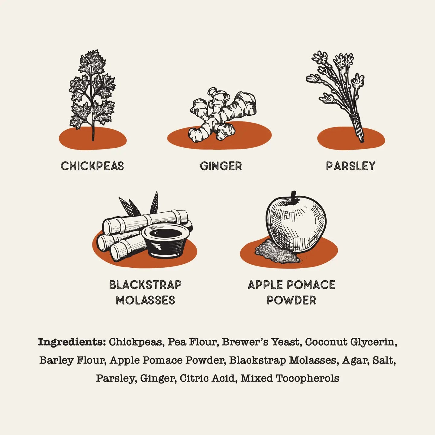 Ingredients Chickpeas, Pea Flour, Brewer's Yeast, Coconut Glycerin, Barley Flour, Apple Pomace Powder, Blackstrap Molasses, Agar, Salt, Parsley, Ginger, Citric Acid, Mixed Tocopherols