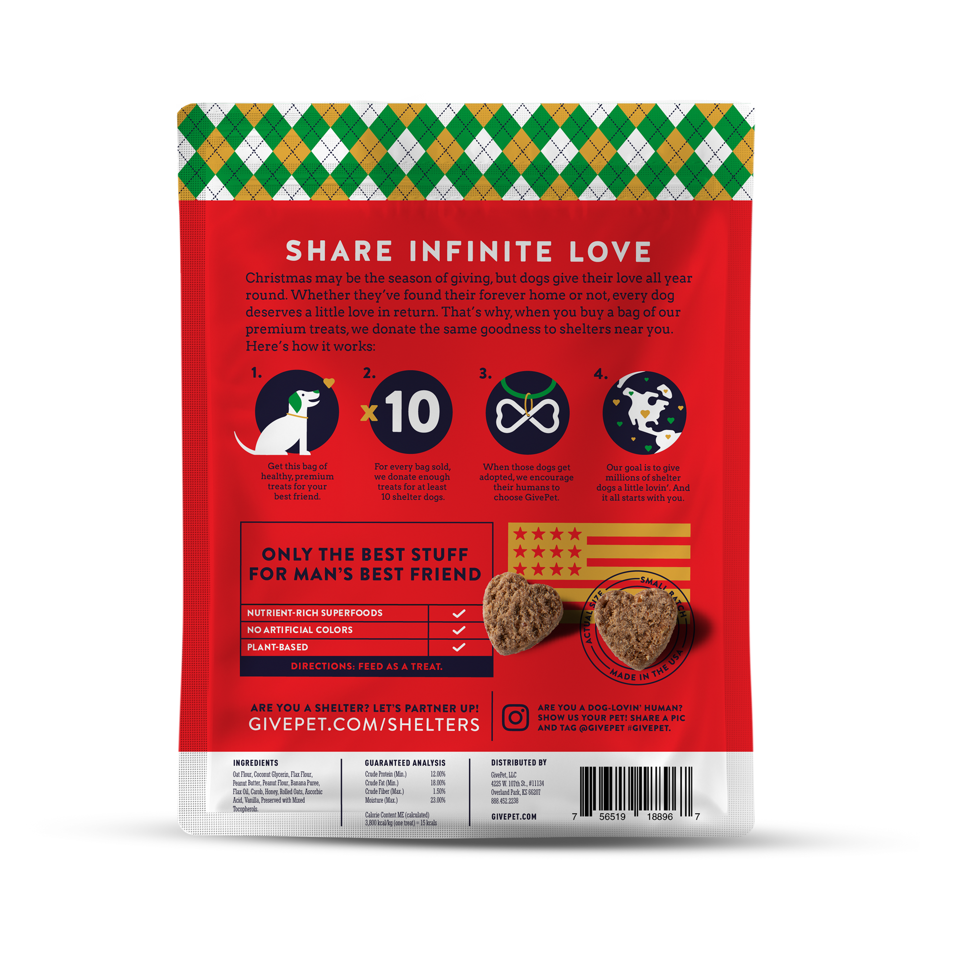 Available for a limited time only! 6oz bag of holiday-themed soft baked treats. Made with nutrient-rich whole foods and superfoods. Peanut butter, banana and carob flavor.