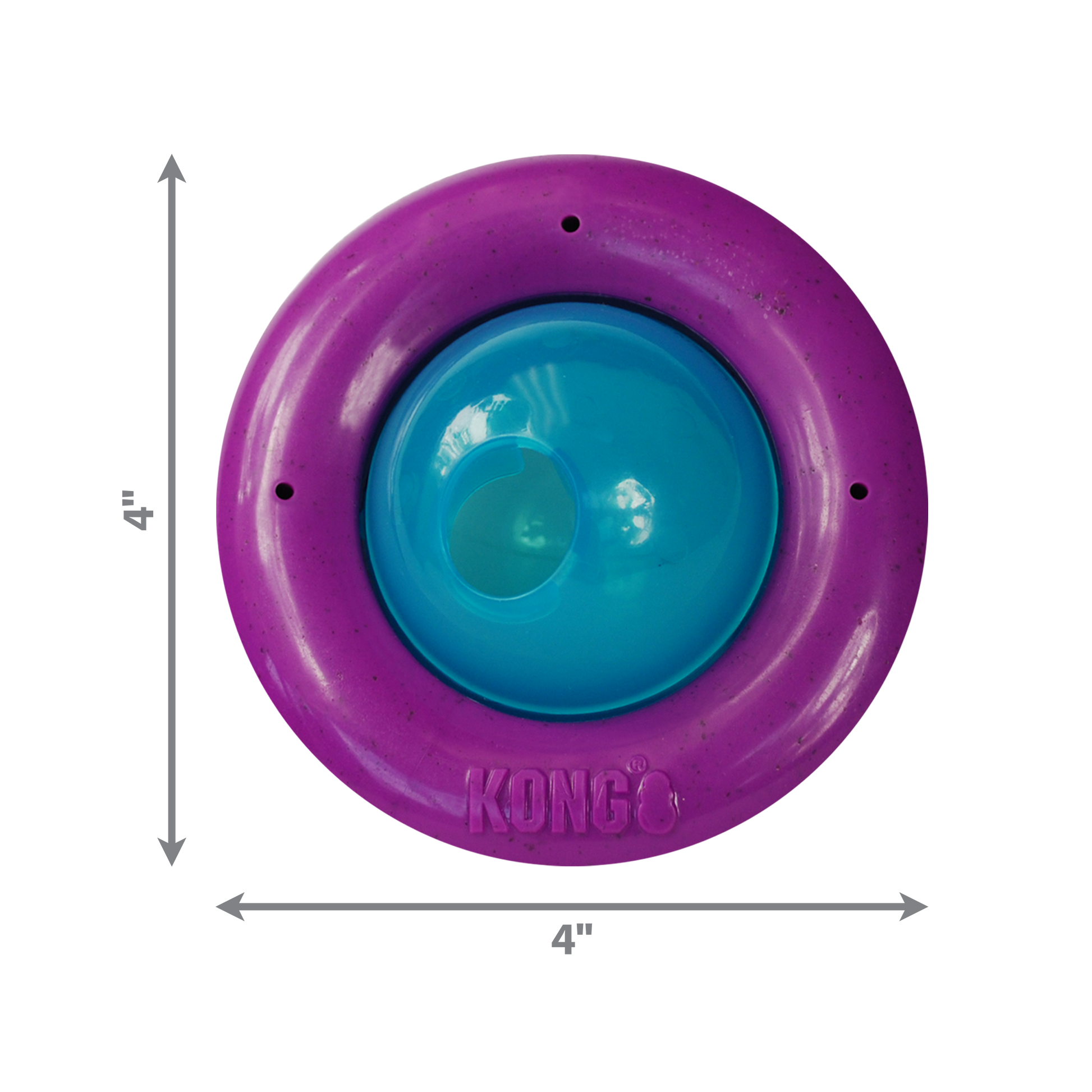 The KONG Cat Gyro is the ideal food and treat dispenser that has a roll and spin action that, engages cats’ in a mentally stimulating food puzzle. When batted, it flips over, sparking cats’ stalking and pouncing instincts. Infused with potent KONG North American Premium Catnip oil, it also features a bell in the outer ring both combining to extend play sessions. Its removable middle container is easy to fill and clean. Holds 1/3 cup of food, making it an ideal bowl replacement.