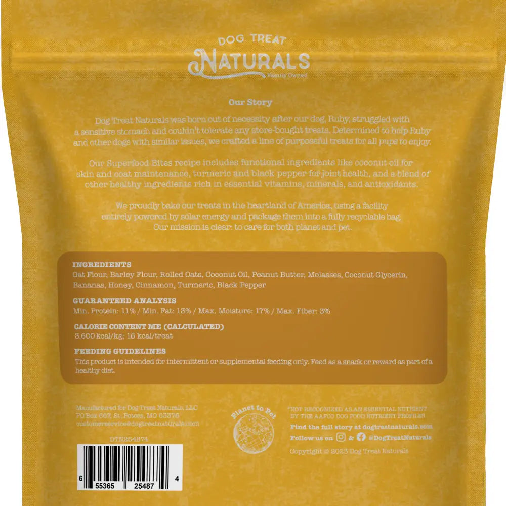 Peanut Butter & Banana Superfood Bites We've combined wholesome ingredients that deliver a powerhouse of vitamins, minerals, and amino acids through the natural ingredients in our bites. Superfoods like turmeric, honey, fruit, and cinnamon are a healthy addition to your dog's daily diet.