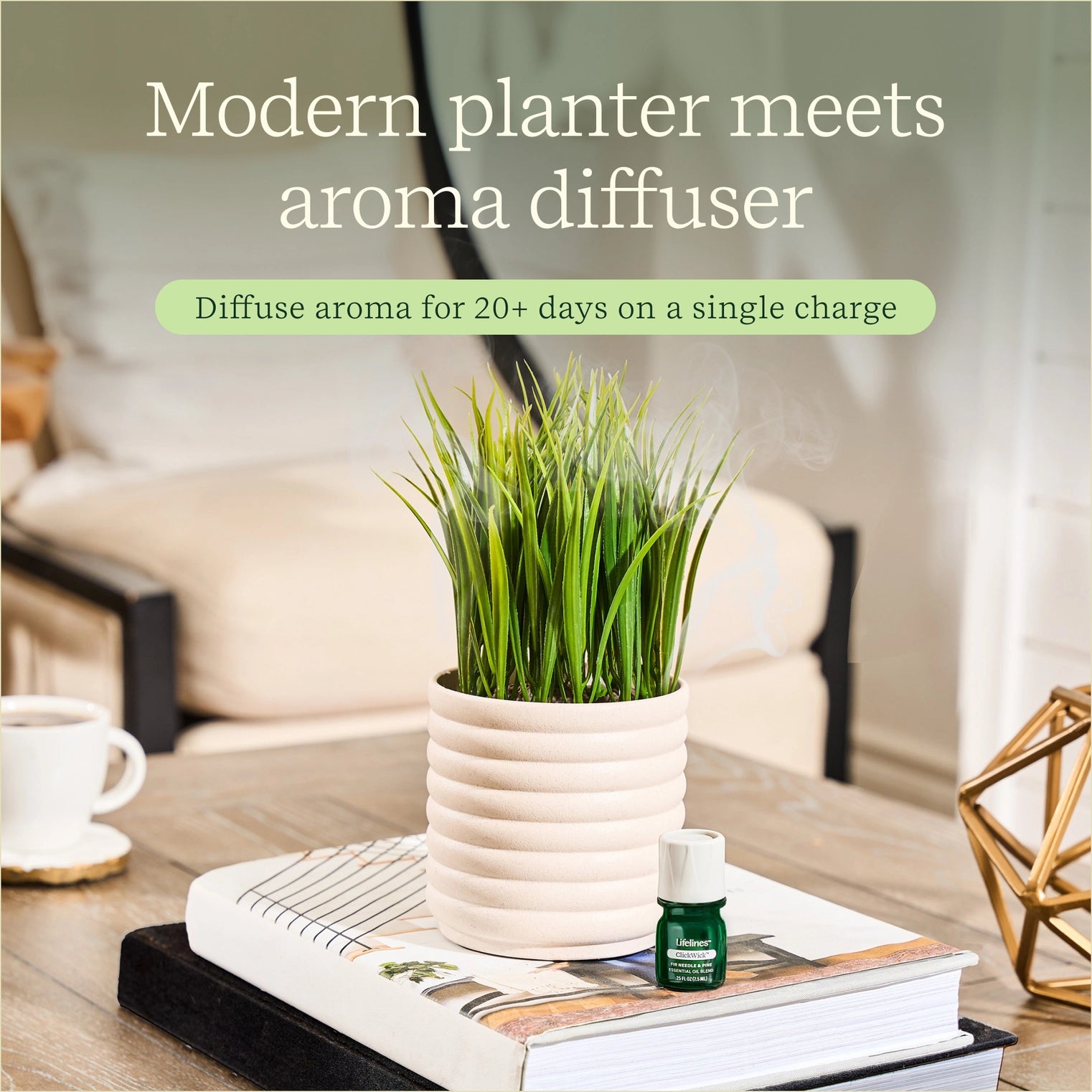 This beautiful faux plant doubles as a diffuser, filling your space with delightful aroma throughout the day. No watering, sun, or re-soiling needed! Includes bottle of Lifelines Essential Oil Blend with innovative ClickWick™ design, allowing bottle to click into the bottom of the planter for a seamless aroma experience. Simply insert the included oil blend and be soothed by the scents of nature. • Beautiful modern planter and realistic faux plant fits into any décor • Diffuses aroma for 20+ days on a single charge; USB charger included • Includes Lifelines Essential Oil Blend • Innovative ClickWick™ diffusion bottle clicks into bottom of diffuser; no water required, and no messy spills! • Blend is free from parabens, phthalates, dyes, and formaldehyde • Can be used with any Lifelines ClickWick™ blend, so you can swap out the included oil and diffuse whatever suits your mood