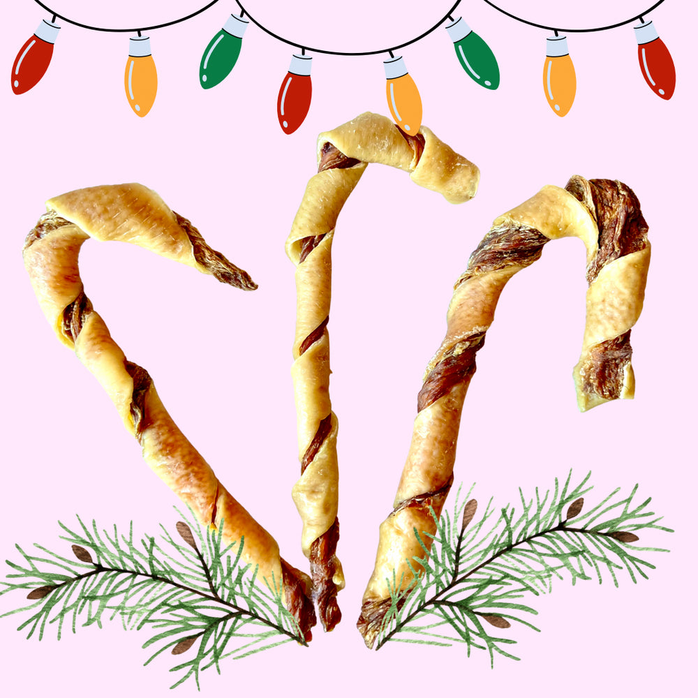 Dehydrated Pork “Candy Canes” Made from twisted, Locally Farmed Pork Hide & Human Grade Pork Loin. These will be a Light to Medium chew, appropriate for all size Dogs! Canes are approximately 8” in length.