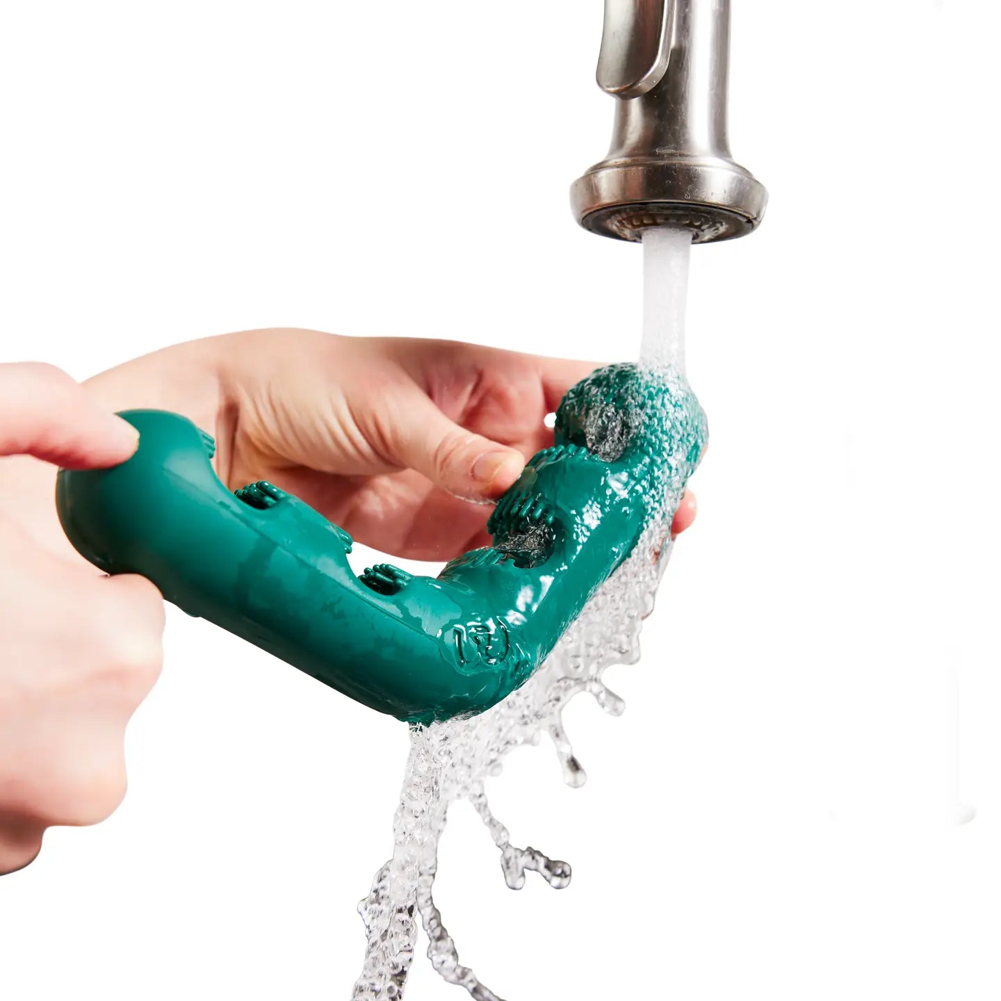 The Bite n’ Brush is made of a non-toxic, BPA- and phthalate-free natural rubber, and comes in two sizes: Small (best for dogs under 25lbs), and Large (best for dogs over 25lbs).